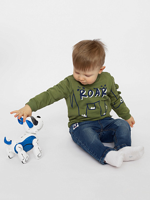 Джемпер для мальчика с длинными рукавами. Горловина, рукава и низ изделия с эластичной резинкой. На полочке декоративная шелкография.