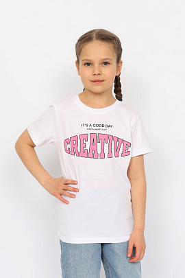 Футболка для девочки с трендовым колледж-принтом, с блестящим эффектом и контрастными бейками по горловине и рукавам. Модель сделана из 100%-хлопкового трикотажа. Материал приятно прилегает к телу, не сковывает движения и позволяет коже дышать.