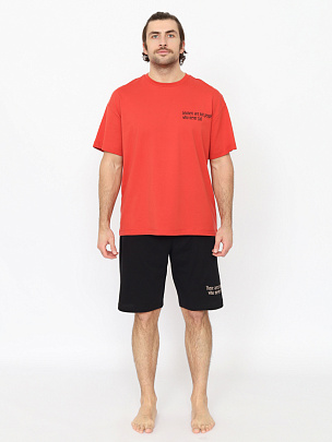 Гладкокрашенная пижама из футболки и шорт. Футболка свободного покроя с коротким рукавом. Горловина обработана притачной бейкой из рибаны с лайкрой. Перед оформлен небольшим принтом. Шорты свободного покроя длиной ниже колена выполнены из полотна дополнительного цвета. Цельнокроенный пояс обработан плоским швом вподгибку с одновременным прокладыванием резинки. На левой половинке внизу небольшой принт.