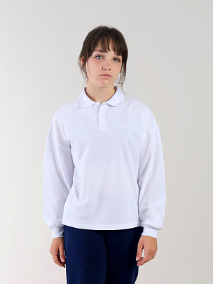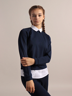 Джемпер с длинным втачным рукавом и манжетами. Перед с нефункциональной застежкой на пуговицы. Манжеты, планка и пояс выполнены из полотна с добавлением эластана. В горловине расположена эмитация рубашки с отложным воротником и стойкой.
