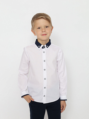 Джемпер с длинным втачным рукавом и манжетами. Перед с нефункциональной застежкой на пуговицы. Манжеты, планка и пояс выполнены из полотна с добавлением эластана. В горловине расположена эмитация рубашки с отложным воротником и стойкой.