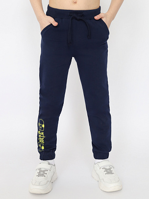 Брюки для мальчика с накладными карманами с клапаном. Нижние срезы брюк оформлены притачными манжетами из полотна с эластаном. Пояс притачной, с резинкой и функциональным шнуром. На карман настрочена декоративная жаккардовая этикетка.