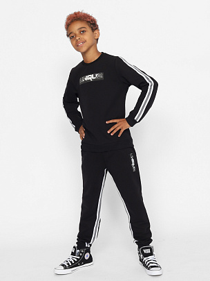Джемпер с длинным втачным рукавом. Низ изделия и рукава обработаны поясом и манжетами из полотна с эластаном. Рукава декорированы вязаными лампасами. Перед декорирован принтом с эффектом "Высокая база" "УНИКАЛЬНЫЙ". Брюки с притачным поясом и манжетами. В пояс вставлена резинка и функциональный шнур. Пояс и манжеты выполнены из полотна с эластаном. На передней части брюк расположены карманы с подрезным бочком. Шаговые швы декорированы вязаным лампасом. Передняя половинка брюк декорирована принтом с эффектом "Высокая база" "УНИКАЛЬНЫЙ".