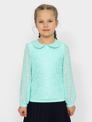 Джемпер для девочки с длинными рукавами и отложным воротником. Рукава из сетки с манжетами из кулирки. Полочка двойная - нижний слой из кулирки, верхний из сетки. Сзади застежка на пуговицу.
