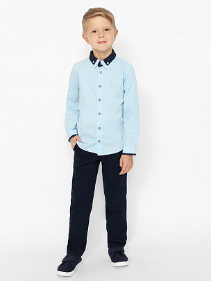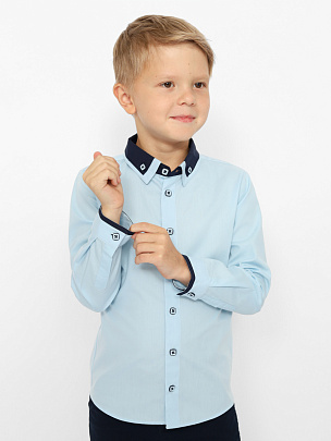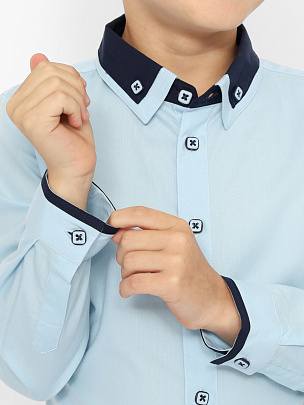 Рубашка классическая, полуприталенного силуэта, с длинным рукавом рубашечного покроя, с притачными манжетами, с застегивающейся шлицей рукава. Воротник двойной, обтачной с притачной стойкой контрастного цвета и декоративными пуговицами. Манжет с отрезной планкой контрастного цвета.